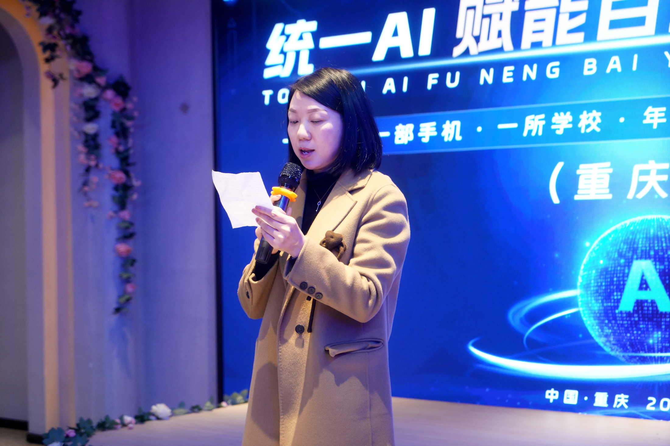 峰会开篇,统一AI重庆运营中心负责人陈怡君女士登台致辞,阐明本次峰会的核心初心:“我们今日相聚,不止是共探行业趋势,更是为集结有志之士,共赴一场教育赋能的初心之约——既将前沿AI教育解决方案送达万千家庭,点亮孩子成长之路;亦将前景广阔的轻创业机遇赋能奋斗者,共启财富新程。”